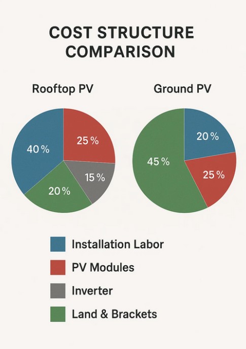 Při porovnávání těchto dvou systémů je důležitým faktorem cena. Střešní fotovoltaické systémy mají obecně nižší náklady na využití půdy, protože využívají stávající stavební konstrukce. Složitost instalace však může zvýšit náklady, pokud mají střechy nepravidelný tvar nebo vyžadují vyztužení. Pozemní fotovoltaické systémy mají obvykle vyšší počáteční náklady kvůli přípravě pozemku, stavbě základů a nosných konstrukcí. Pozemní systémy však často umožňují úspory z rozsahu, což je činí nákladově efektivními pro velké projekty. Celkové investiční rozhodnutí závisí na dostupných půdních zdrojích, očekávaném energetickém výkonu a dlouhodobé návratnosti investice.